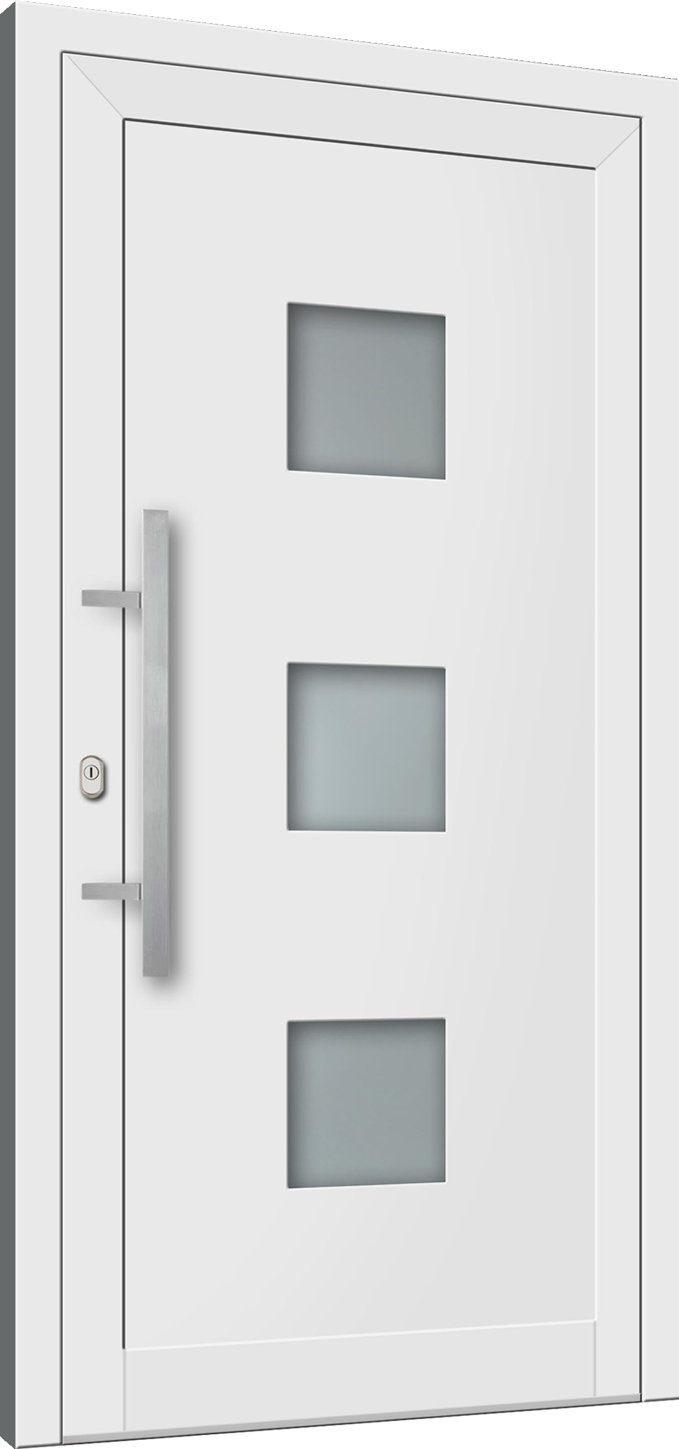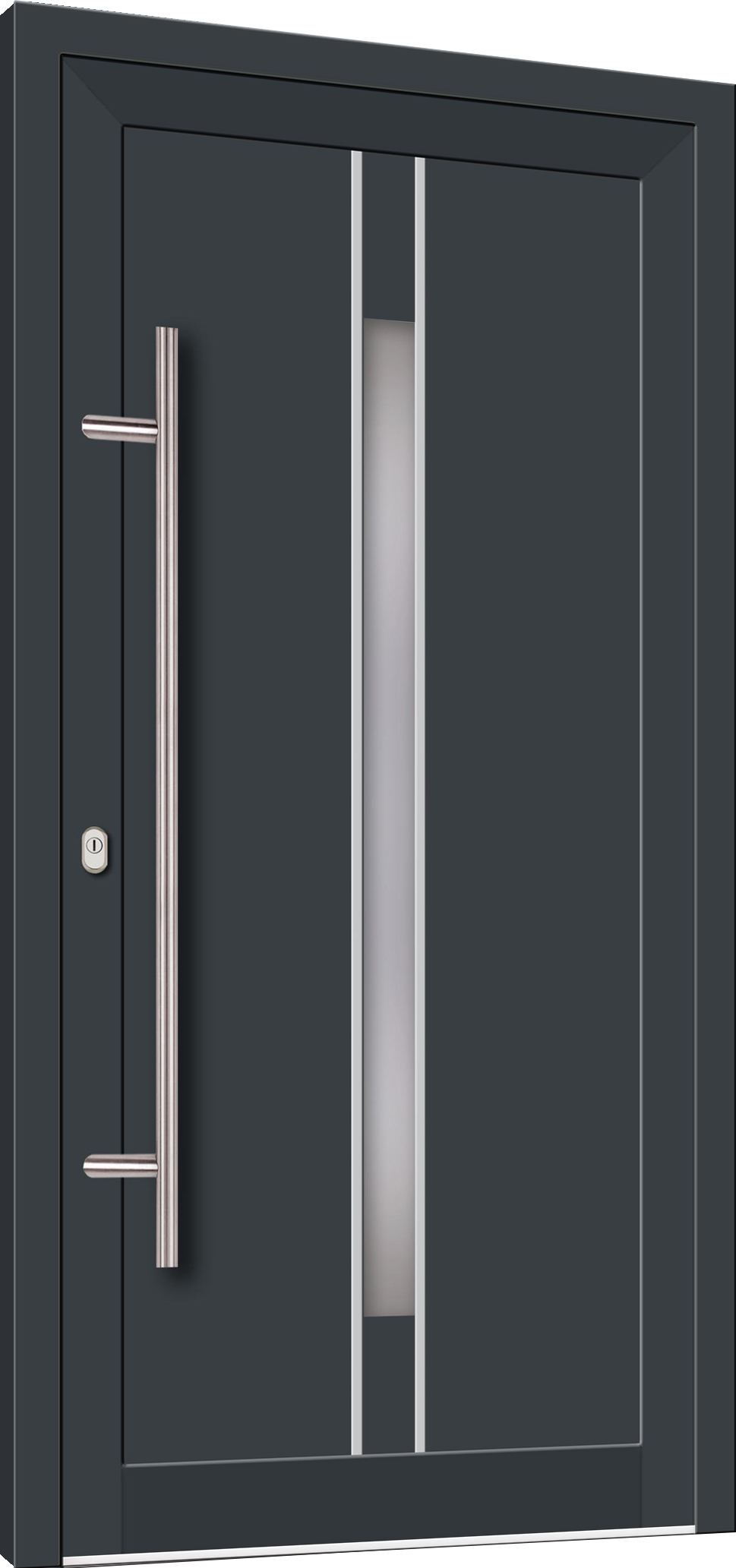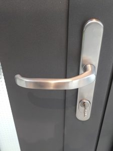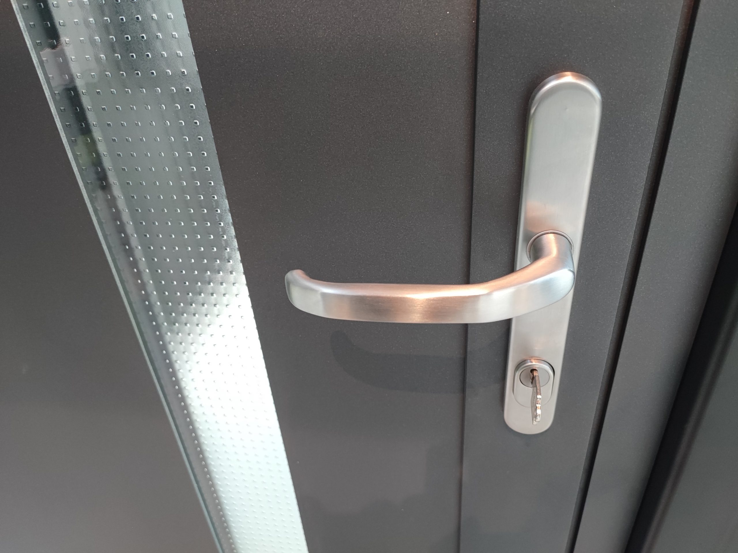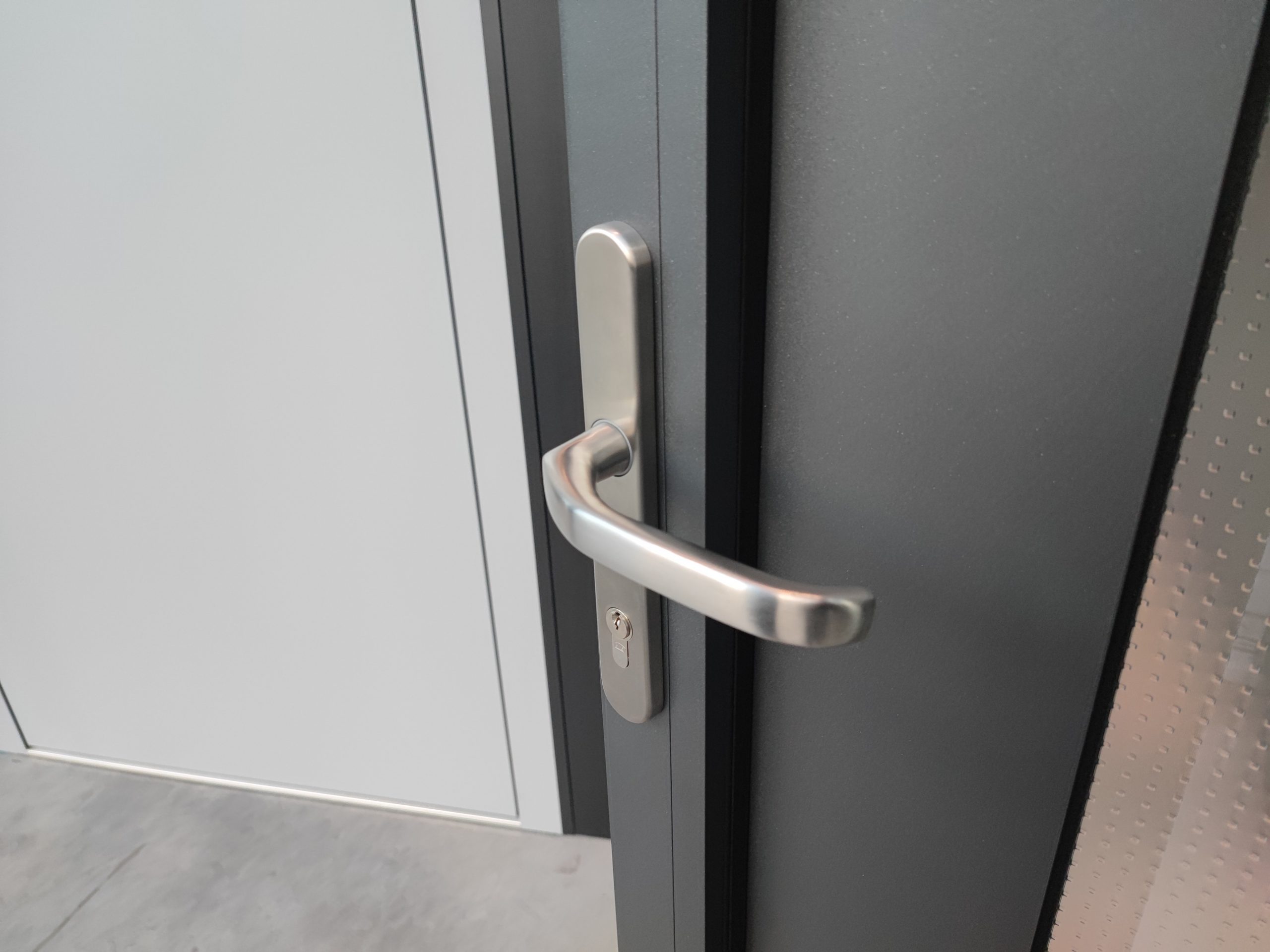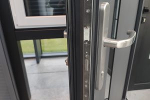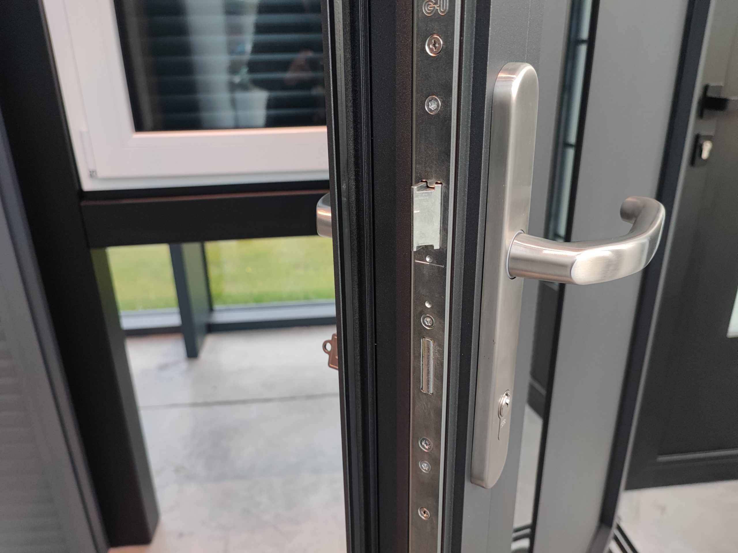 Les portes EcoThermo 75 garantissent un haut niveau de fonctionnalité et de sécurité. Elles sont équipées d’une serrure multipoint 3 points de haute qualité GU MR2, commandée par clé, ainsi que de paumelles doubles (trois par ouvrant), laquées dans la couleur du cadre et réglables sur trois axes.