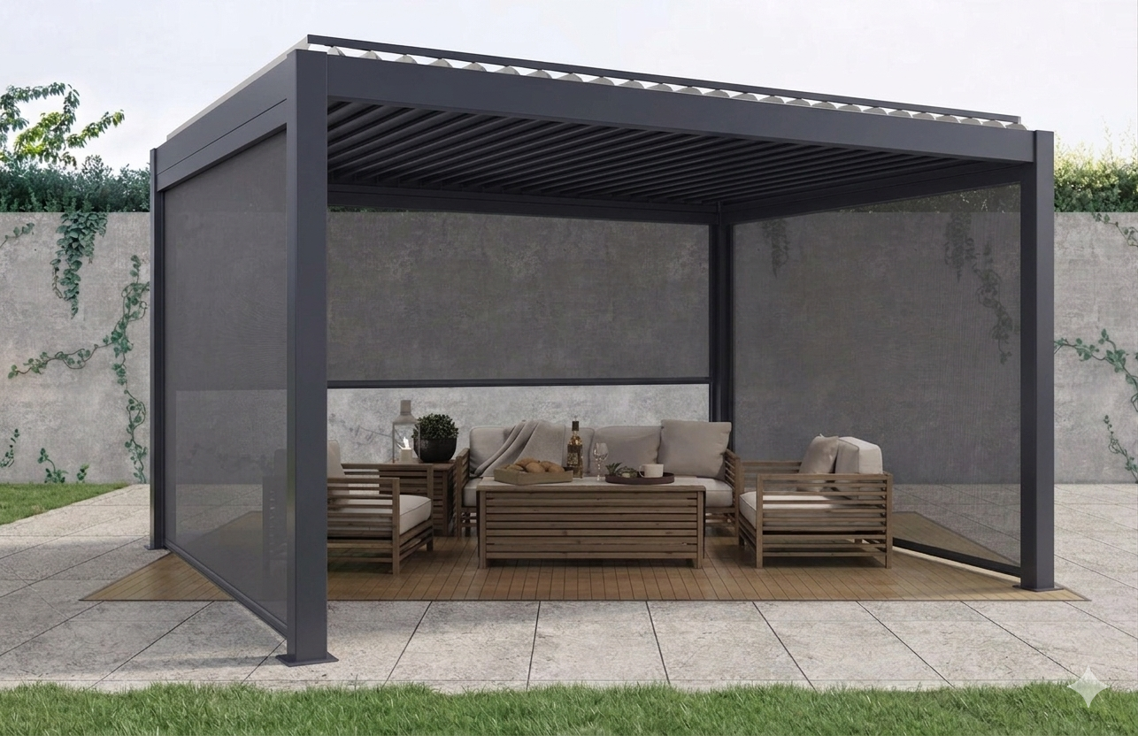 Le ZIP-Screen ECO est parfaitement compatible avec les pergolas en aluminium, les toitures de terrasse, les jardins d’hiver et les grands systèmes coulissants. Possibilités de montage : entre les poteaux de la structure, à l’extérieur de la structure, en configuration avec des vitrages coulissants de type slide glass.