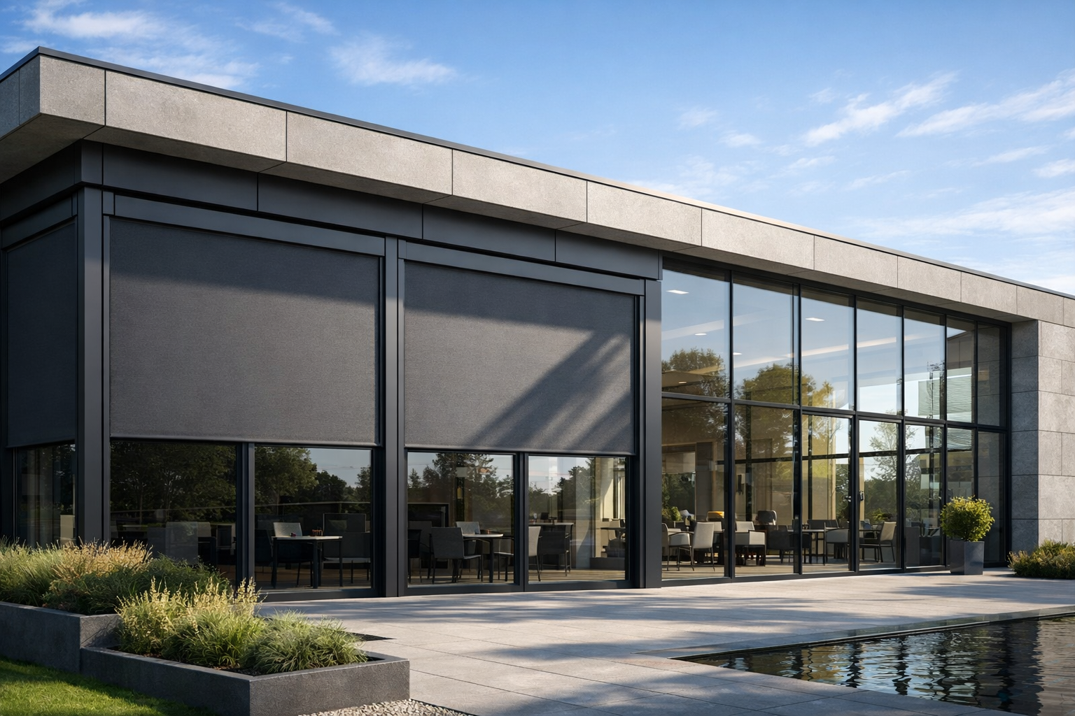 Où est-il le plus adapté ? Le ZIP-Screen ECO est une solution idéale pour les grandes surfaces vitrées dans les maisons individuelles, les terrasses et jardins d’hiver, les pergolas bioclimatiques, les restaurants et espaces horeca, ainsi que les bureaux et bâtiments commerciaux.