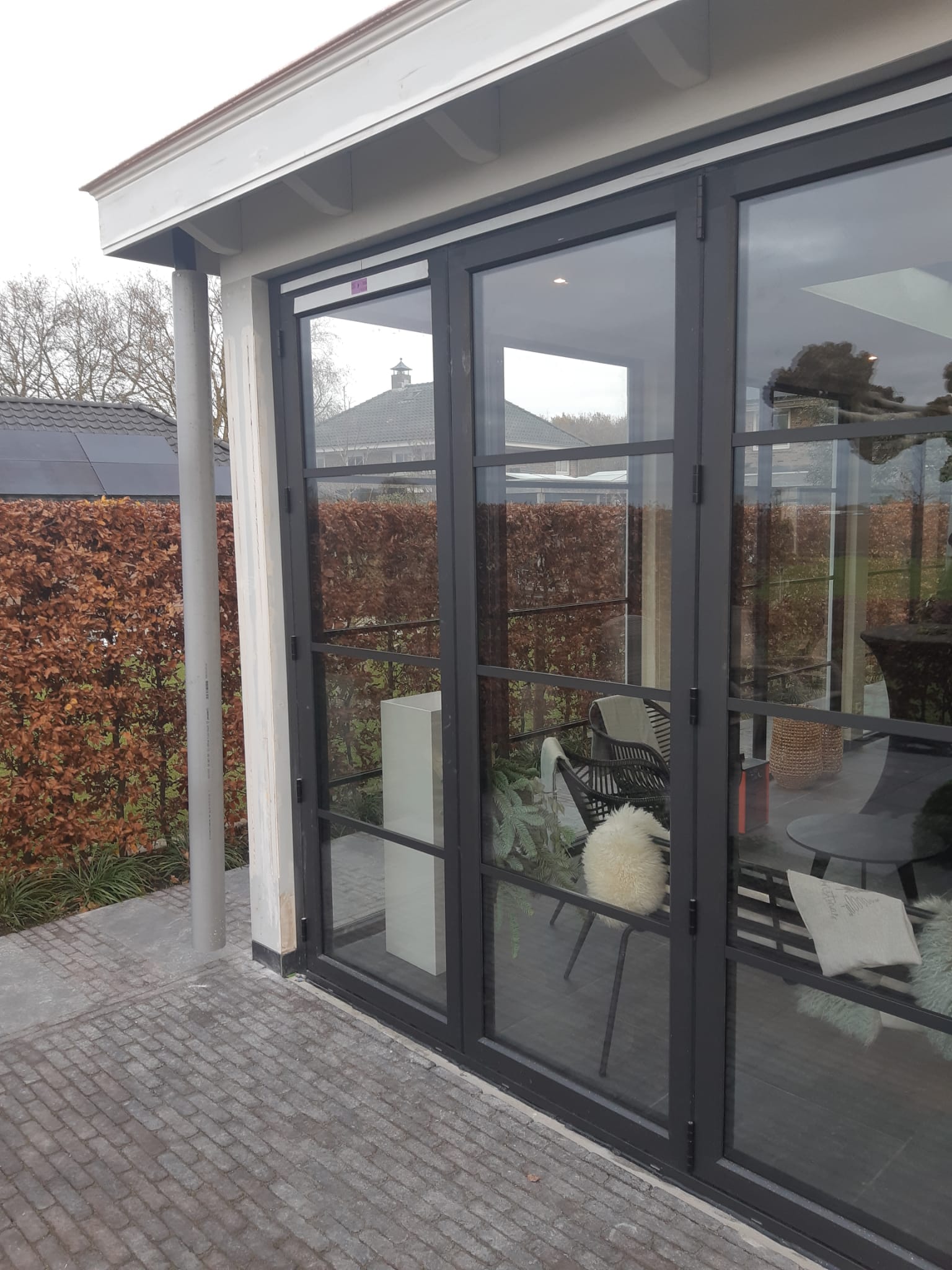 Les poignées Sobinco des portes pliantes sont proposées dans la même couleur que la construction. Leur design fin s'adapte parfaitement à la géométrie étroite des profilés. Il est possible d'utiliser une poignée étroite sous un volet roulant. |