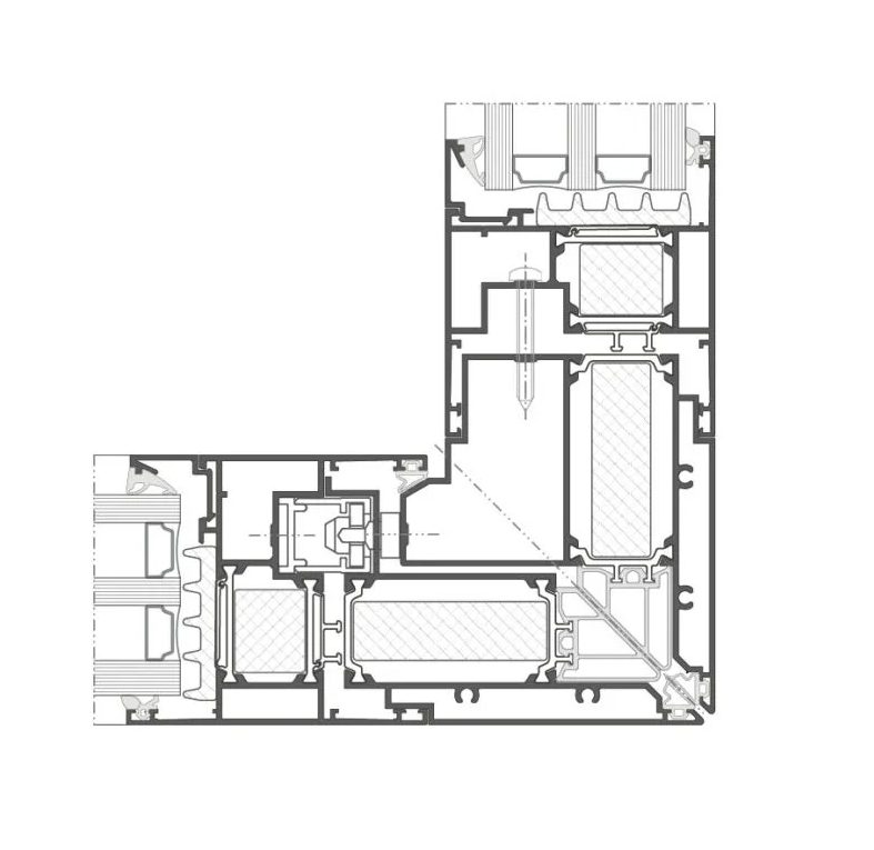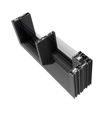 Dans le cas de constructions d’angle à 90°, une solution de plus en plus populaire, à la place d’un raccord en profilé aluminium, est l’utilisation d’une jonction entièrement vitrée. Une autre option intéressante est l’utilisation de vitrage stepped (à gradin) monté sur le vantail. Dans ce cas, seuls le cadre et le vitrage sont visibles, celui-ci masquant le vantail et le montant.
