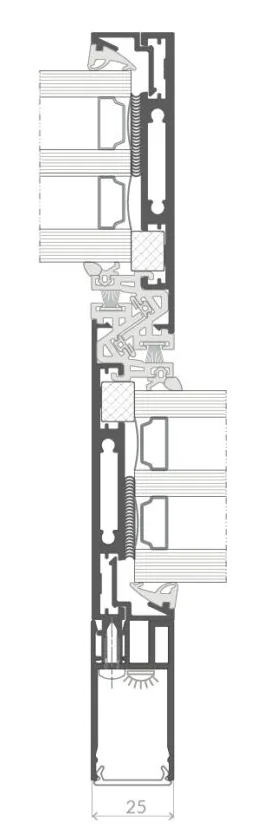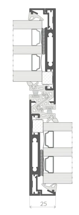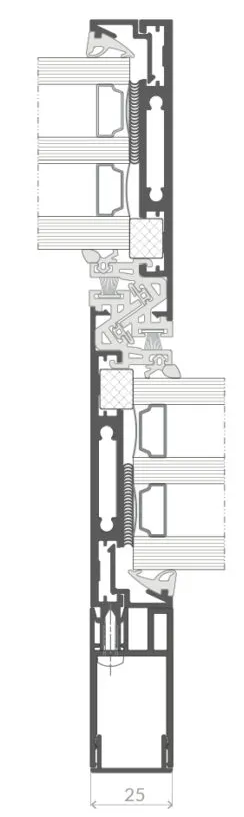 Une solution particulièrement esthétique. Dans la variante Ultra, la largeur du montant n’est que de 25 mm. Afin d’augmenter la rigidité, des profils de renfort sont montés à l’intérieur et à l’extérieur sur la face du montant. Une option intéressante est l’intégration d’un éclairage LED dans le montant de 25 mm.